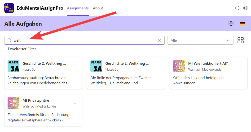 Benutze das Suchfeld, um nach Begriffen zu suchen. Dies können Themen, Textinhalte, Namen, Schulfächer usw. sein.Alle Assignments, in welchen der Begriff vorkommt, erscheinen sofort während dem Tippen.