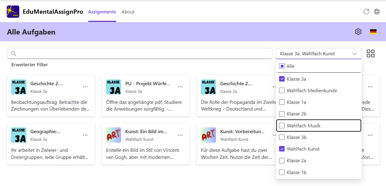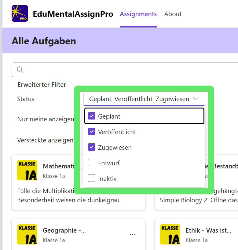 **Es erscheinen keine oder nur sehr wenige Aufgaben?**Vielleicht haben deine Kolleginnen und Kollegen die EduMentalAssignPro App noch nicht benutzt. Fordere Sie doch dazu auf. Die Daten werden bei jeder Benutzung abgeglichen.